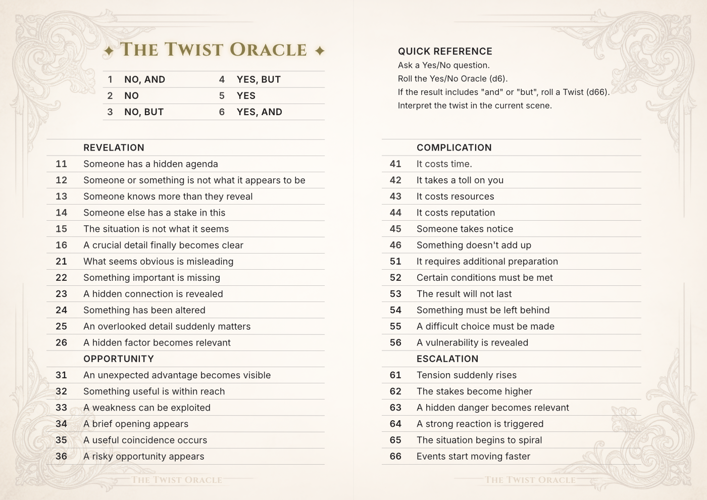 The Twist Oracle is a lightweight oracle that turns simple Yes/No answers into narrative twists for solo RPG play.